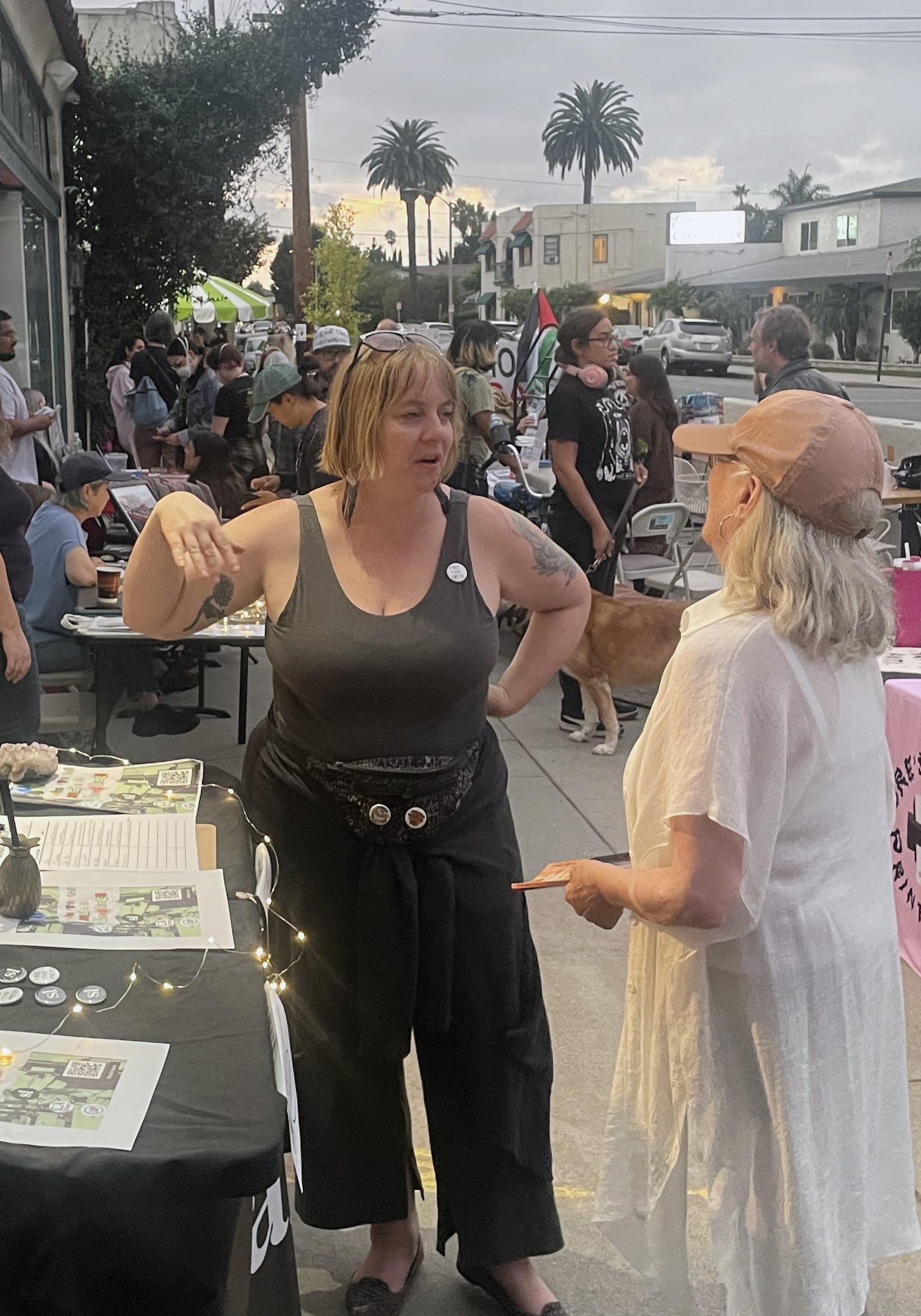 Sundays are for in-person meetings! Photo credit: Abraham Márquez (left photo). Southlander worker-owner Erin Foley speaks to a Long Beach local outside Page Against The Machine on Friday, Sept. 26. Photo credit: Greg Diaz.